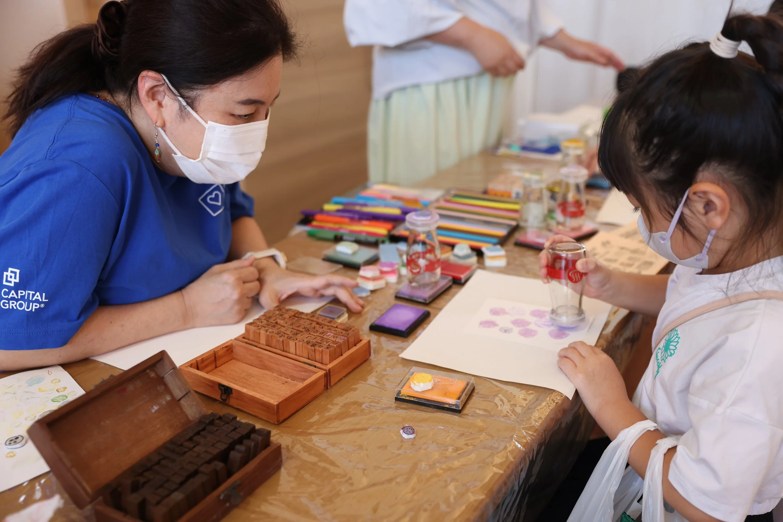 9月6日7日、横浜こどもホスピスーうみとそらのおうちーにて、キャピタルグループのブースのアート講師として、消しゴムハンコで作る絵葉書ワークショップ実施